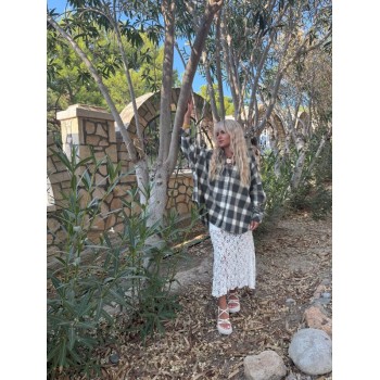 Koszula MINI Vintage Brown. Wykonany z 65% poliester, 32% wiskoza i 3% elastan. Polska produkcja. Modelka 150cm wzrostu. Rozmiar XS/S. Koszula odpowiednia dla osób o wzroście do maksymalnie 163cm.