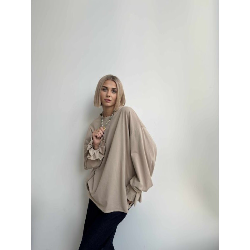 Bluzka beige falbanka. Kolor beżowy. Wykonany z 95% bawełnai 5% elastan. Polska produkcja. Modelka ma 173cm i rozmiar M/L.