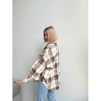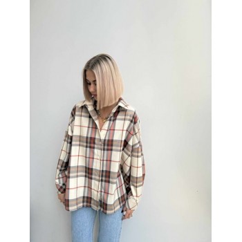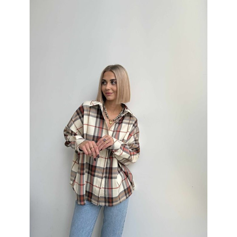 Koszula latte MINI. Wykonany z 65% poliester, 32% wiskoza i 3% elastan. Polska produkcja. Modelka 150cm wzrostu. Rozmiar XS/S. Koszula odpowiednia dla osób o wzroście do maksymalnie 165cm.