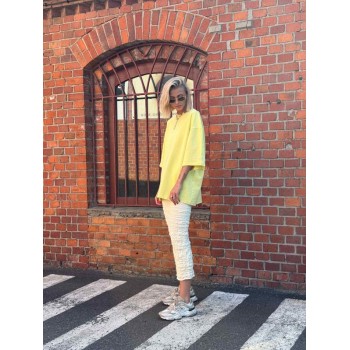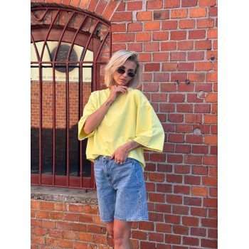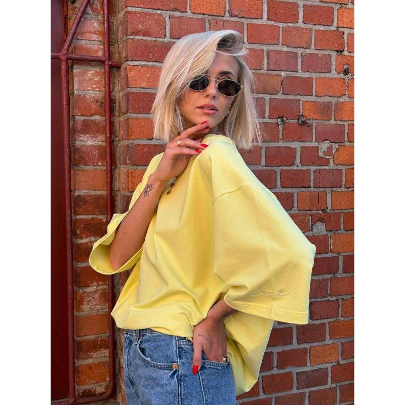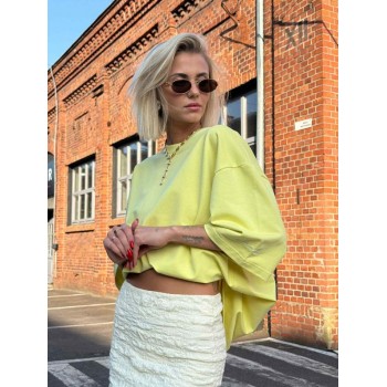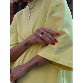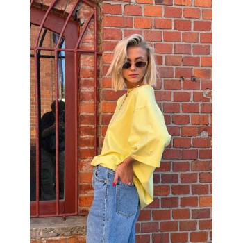 Koszulka limonka. Kolor żółty z niebieskim haftem. Wykonany z 95% bawełna i 5% elastan. Haftowane logo. Polska produkcja. Modelka ma 173cm i rozmiar M/L.